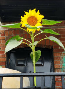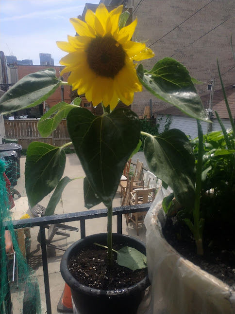 He continued to grow quickly and so sturdy. Still it took me a moment to recognize: He was a Sunflower! King Basil! A magnificent, singular Sunflower most probably grown from bird seed. shhh! I’m not supposed to do that but the truth is I still care for a whole flock of sparrows out there lol! And he became the main character in one of the most wonderful summer love stories in all my life. Our wild love affair was perfect in every way. Except the sparrows ate all the seeds before I could get even one. Ate them right out of his middle!
